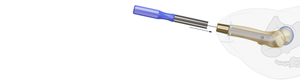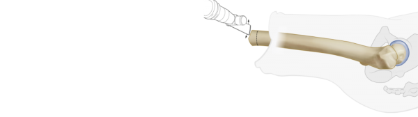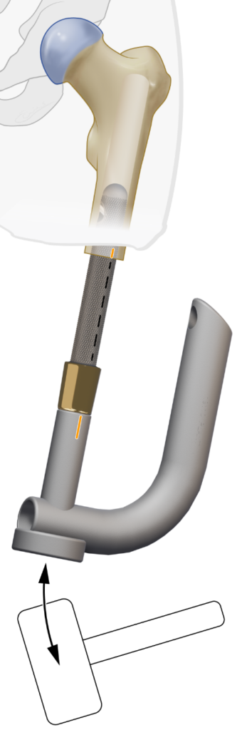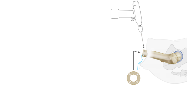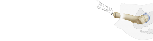 The OFI-Y stem is placed on the Guiding Device and press-fit hammered into the femur. During insertion check that the longitudinal mark on the OFI-Y stem exactly matches with the mark on the femurtip or Aiming Device.