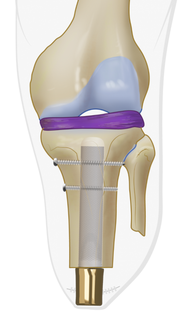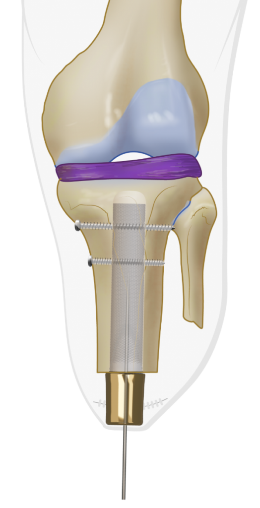 The OTI stem is placed on the Installer and press fit hammered into the tibia. Under Xray guidance.