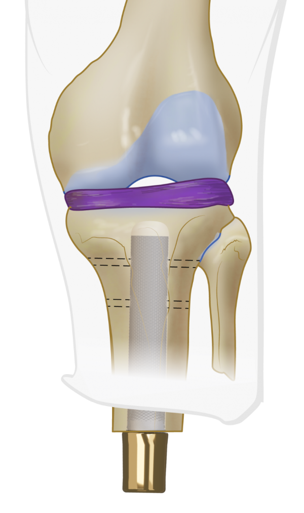 After releasing any tethering tissue, nerves are identified and, if present, any existing neuroma excised. The distal end of the tibia is cut with an oscillating saw according to calculations in the pre-surgical plan.